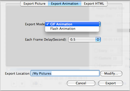 Or click "Export Animation" button (the second one) to open "Export Animation" dialog, set the "Export Mode", "Each Frame Delay (Second)" and "Export Location" option to export captured pictures as animation.
