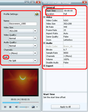 In the "Advanced Profile Settings" panel, enter the start time and duration of the wanted segment respectively in the "Start Time" and "Duration" textbox. The segment you specify will be converted automatically during conversion.