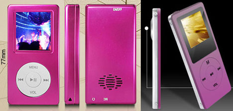 If imitation is the sincerest form of flattery, rest assured Apple won't be scaling giddy heights having their iPod nano being duplicated in such a demeaning manner. The purple Platinum 2.0 and pink-colored Neon MP4 player share the basic characteristics of an iPod clone - a 1.5" 65k color display, MP3, WMA, WAV, and ASF file format support, an integrated FM radio, and video playback capability. What was added (other than the gaudy colors) is a built-in speaker which the iPod nano lacked. Both the Platinum 2.0 and Neon MP4 player weigh approximately 30 grams and costs $51.99 and $49.99 respectively. At this price level, you can pick one up for kids who are prone to breaking stuff easily.