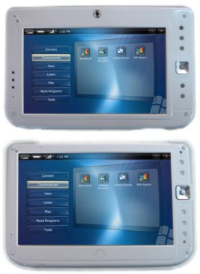 Just from the appearance there is noting special of Mobits' new X15 UMPCs, while it is much more interesting in the specs. Because of the stylish VIA CX700 chipset, which supports hardware TV encoding and WMV9 decoding, Mobits' new X15 UMPCs run a VIA C7M 1GHz processor and combine 512MB or 1GB of DDR2 RAM. The displays of the Mobits' new X15 UMPCs get 800 x 480 for the 7-inch model and 1024 x 600 for the 5.6-inch one. The Mobits' new X15 UMPCs combines standard fare of 802.11a/b/g and 30 or 60GB HDD, along with stereo speakers, a fingerprint sensor and the same mouse pointer as the one of TabletKiosk eo UMPCs. It also features a LAN port, TV-out and an SD card slot. It may include a built-in camera, GPS, DVB-T and DVB-H. Based on the screen sizes it is hard to tell which is which from the picture. While the launch is drawing close, this will be clear very soon.