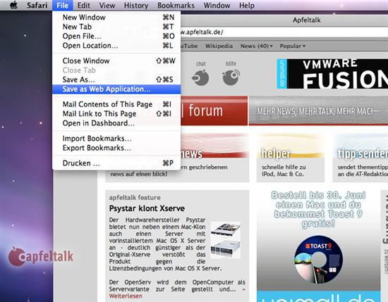 Safari 4 offers a "Save as Web Application" menu item to help users create web apps that can potentially be used offline. This feature extremely attracts the Google Docs or Photoshop Express fans.