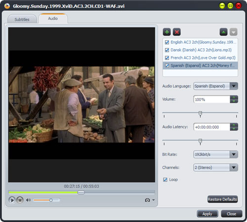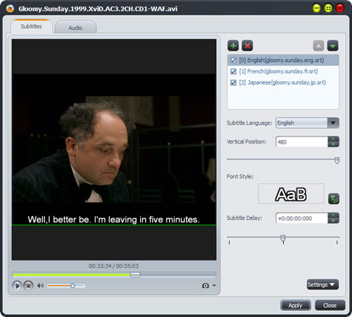 Choose a video file in the file list, then click "Subtitle" button on the toolbar to enter the subtitle window, on which click the plus icon on the right panel to choose the subtitle you want to add in the dialog that opens, then the subtitle is displayed in the subtitle list. You can add up to 8 subtitles into the video. Click "Apply" and "OK" to return to the main interface.
