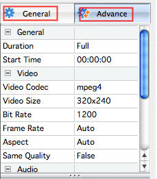 After selecting certain output format, you can choose "General" tab on the right top which will show its general standard. You may set "Video Quality", "Audio Quality", "Output filename" by clicking "General" button on the right of the interface. If you're professional user, you can choose "Advance" tab on the right column.